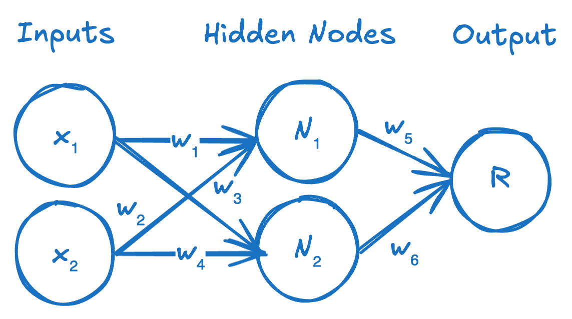 If we want to train this neural network, we need to do so by gradient descent, which involves taking the partial derivatives of the neural network with respect to its parameters (the “weights”).