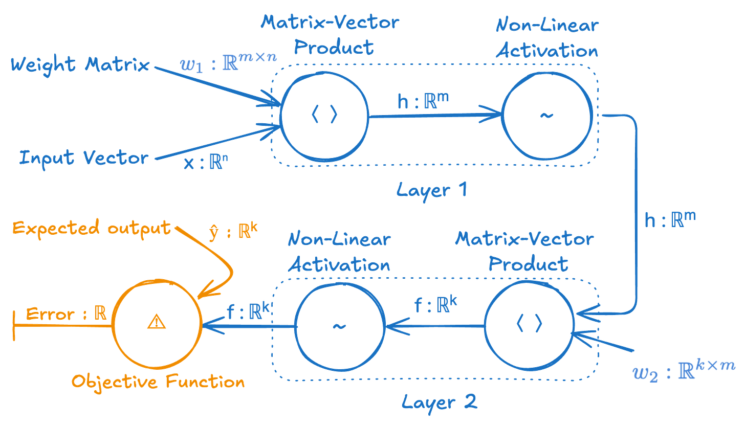 This may look more complex than the traditional neuron-focused depiction of a neural network, but it’s really not, and it tells you exactly how to implement this neural network in code. It shows the step by step functions that occur and the inputs those functions operate on. It also shows the types of all the data flowing through this computational graph.